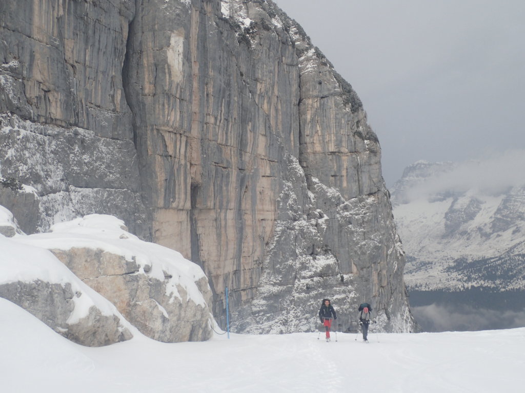 Attrezzata la linea di progressione ci caliamo fino alla base, 50 metri sono stati arrampicati, forse di più. Il pozzo sotto la risalita si rivela, inoltre, esser più profondo di quanto valutato, le pietre la volta passata si fermavano presumibilmente su di un terrazzo ma buttandone giù alcune dalla parte opposta battono almeno 80, se non più…. Ci attende ora una lunga marcia verso l’uscita. Alle 10 di domenica mattina siamo tutti fuori, 22 ore di punta. Cambiati alla caverna d’ingresso re-infiliamo gli imbraghi e ci caliamo in parete. La nebbia che ci ha accolto all’uscita si dirada, e lascia spazio al bianco candore del magico paesaggio caninico, rovinato solamente dal fastidioso brusio degli impianti sciistici. Risaliamo verso il rifugio Gilberti per premiarci con una meritata birra, preambolo di un abituale sofferente ritorno a casa, prima di poter finalmente svenire sul divano.