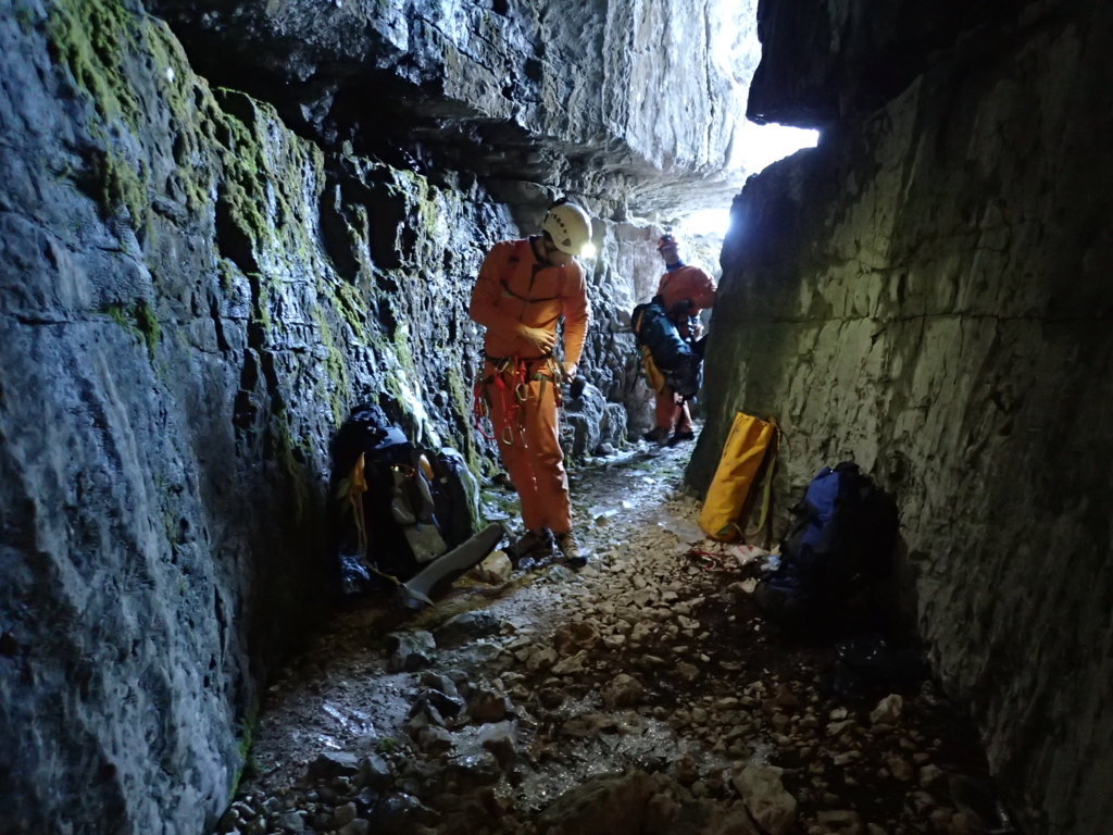 Siamo nuovamente in 3, Alessandro Benazzato (Club Speleologico Proteo Vicenza), Alessandro “Sandrin” Mosetti(GTS) ed io. Obbiettivo di questa punta: risalire! Perché i pozzi non si scendono, si arrampicano! (…e speremo de no ciapar de mone se no trovemo un klinz…..). Saliamo il sabato mattina, tappa al Gilbo per un caffè e per salutare Irene e Fabio, gestori del rifugio, e poi via verso il Bila Pec, dove con una risalita in parete si accede all’abisso Rolo, uno degli ingressi del sistema del Col delle Erbe-Gortani (circa 45km sviluppo). Una serie di verticali, intervallate da corti meandrini, ci porta velocemente a 400m di profondità. Da qui fino alle zone esplorative sarà tutto un salire e scendere tra frane, ambienti di crollo, grandi fratture e grandi gallerie. Perdiamo tempo a fare qualche filmato e qualche foto (siamo passati da non documentare niente ad essere in 3 con 3 fotocamere!!!), ciononostante, in circa 6 ore siamo in zona esplorativa. Ci turneremo nell’artificiale, comincia Sandrin, io faccio sicura, Benaz documenta con qualche foto/video.