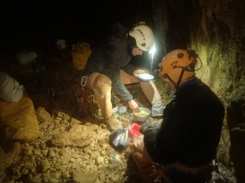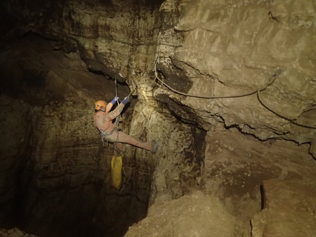 La volta passata, su suggerimenti degli amici ungheresi, eravamo andati a eseguire una risalita sopra il P100, dove la grotta sprofonda di nuovo verso gli attivi, e si perde la quota delle grandi gallerie percorse per arrivare fin questo punto. Obbiettivo ovviamente è ritrovare i vecchi freatici, per poterci spostare ancora verso est, sognando collegamenti con gli abissi del Pala Celar. La risalita purtroppo non ci aveva portato a scovare interessanti prosecuzioni, se non infimi meandrini in testa al pozzo, apparentemente senz’aria. Ma allora tutta l’aria che percorre i rami che portano a questo pozzone da dove arriva? Sconsolati torniamo alla partenza del P100 e ci caliamo sulle corde del pozzo, già disceso dagli ungheresi le esplorazioni passate. Dopo una sessantina di metri individuiamo una promettente finestra dall’altro lato, in direzione esattamente contraria a dove si sviluppano i rami attivi che dipartono dal fondo del pozzacchione. Torniamo alla partenza e prepariamo il materiale, abbiamo 100 metri di corda, traversiamo in alto e ci caliamo pendolando fino ad intercettare il finestrone, 10×5 di diametro, la polvere dei fori dei fix va via orizzontale, buon segno. Entrati nei nuovi ambienti, continuiamo a scendere, pendolando in direzione est, fino a toccare un pavimento solido. La corda arriva giusta fino a qui, non ne abbiamo più, proseguiamo lasciando trapano e attacchi e percorriamo questi grandi ambienti impostati su una imponente frattura, fin dove sarà possibile proseguire? Percorsi una cinquantina di metri, ci affacciamo su un bel pozzone. Giù una pietra! Contiamo……, saranno 50? 60 metri? forse qualcosa di più. Illuminiamo l’ambiente con le luci di profondità, alla ricerca di qualche finestra. Proprio in testa al pozzo, 50 metri più in alto e dalla parte opposta, la forma del soffitto sembra indicarci la presenza di scallops, ci sarà una galleria? Sarà la continuazione delle grandi gallerie da cui siamo arrivati? Certo, la parete da scalare si presenta ostica, quasi tutta da artificiale, un bel lavoretto in sospeso. Intanto ci rifocilliamo e ci avviamo all’uscita, contenti di queste nuove scoperte, sono cmq 5/6 ore di progressione per arrivare fin qua, e qualcosa di più per uscirne stanchi. Alla punta hanno partecipato Stefano “Giusto” Guarniero (Grotta Continua), Edoardo Gobet (GSSG) e il sottoscritto.