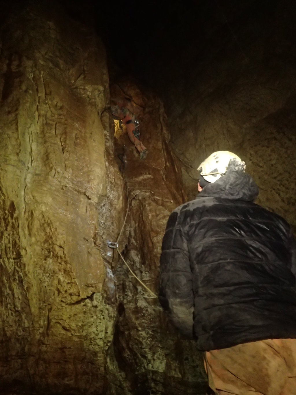 I primi 15m sono semi-arrampicabili e procedendo dentro un canale/diedro, con solo qualche fix per proteggersi e 2 passi sulle staffe, Sandro arriva ad un terrazzo su pietroni incastrati dove prepara una comoda sosta e sistema la corda di progressione. Io salgo e riparto ad arrampicare. Da qui la parete da ben poche speranze di lasciarsi scalare ma in compenso, essendo leggermente appoggiata, ben si presta ad una comoda artificiale. Salendo fino all’ultimo scalino della staffa e complice la mia statura procediamo di 3m in 3m. Qualche passaggio si risolve, anche se poco elegantemente, con qualche metro di scomoda arrampicata in libera guadagnando ulteriori facili metri. La corda sale ormai a fatica, tanti sono gli attriti, sopra di me una nicchia invita ad allestirvi una scomoda sosta. Attrezzo la progressione scendendo, odor di tortellini in brodo ci chiama fin sulla base per una meritata sosta rifocillatrice. Siam coscienti che la corda da 76m che abbiamo portato non sarà sufficiente, ma saliamo comunque. Benaz riparte e arriva a 7/8 metri sotto l’imbocco della finestra, che fregatura, per poco! In questo punto si percepisce movimento d’aria, anche se non si riesce ancora capirne intensità e direzione, ma ci fa ben sperare per la prossima volta. Con il distox prendiamo la direzione, 105/110°, est, perfetto!!! (…e per le prossime settimane, fintanto che non torneremo a finir la risalita, potremmo masturbarci il cervello sognando futuri collegamenti: Zeppelin? Pala Celar? Slovenia?…., sperando sempre che non chiuda dopo pochi metri…).