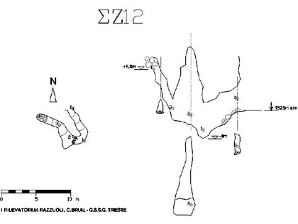 una bella grotta articolata, con concrezioni, due salette e qualche resto di animale caduto, ahimè, nell’intento di brucare la tenera erbetta dell’ingresso. Naturalmente oggi non abbiamo il materiale sufficiente per scendere, decidiamo di fare il rilievo fin dove eravamo arrivati e prendere qualche fotografie, così l’indomani dobbiamo “solo” esplorare. Si ritorna con i rinforzi e con Papo provetto cameraman, che al grido di “ara che figo” documenta perfettamente l’esplorazione della grotta SZ9. Ancora altri due bellissimi pozzi larghi, levigati con intrusioni di selce, veramente interessanti….e poi …una saletta discendente….e una strettoia in basso…minuscola…nooo, resto solo in tuta e provo ad infilarmi, effettivamente ci passo, non vedo niente però c’è un’aria, ma un’aria da ENE Bora!