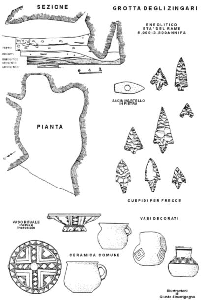 Nel Riparo Zaccaria è stata scoperta una tomba a inumato in posizione rannicchiata e nella Grotta di Santa Croce la sepoltura di un bambino posto in un grande orcio.