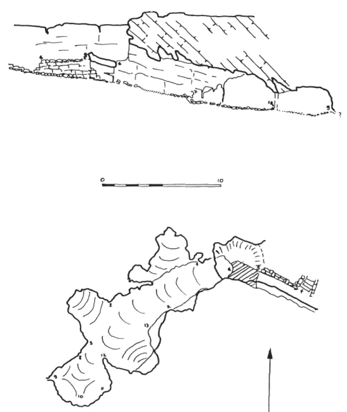 La parte finale della grotta è costituita da una camera pressoché artificiale (punti 3 e 10), vi si notano ancora i fori delle mine fattevi esplodere, volta e pareti sono anneriti fortemente. Dal suolo in leggera discesa e sormontata da un camino che presenta le stesse caratteristiche di quelli segnalati nella prima parte della cavità. Un pertugio, largo un braccio, sembra scendere ancora per qualche centimetro (punto 9), fra roccia e materiale incoerente; una leggera corrente d’aria, la cui provenienza non è stata accertata, rinfresca un po’ l’ambiente.