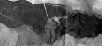 In alto, l'entrata della grotta nella galleria di Cattinara. In basso e a destra gli speleologi impegnati ieri nell'esplorazione. (Foto Paolo Manca)