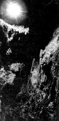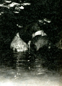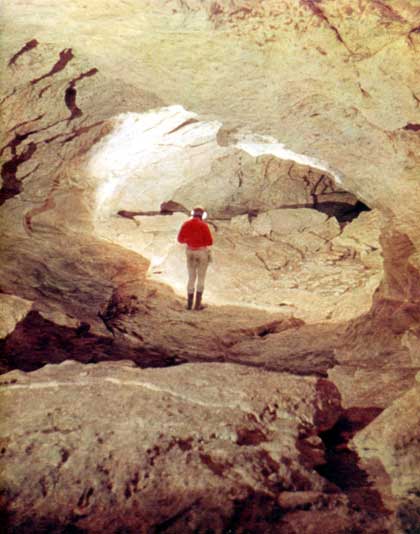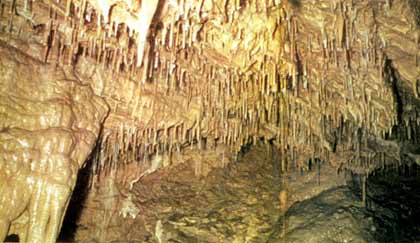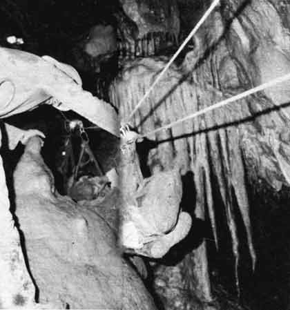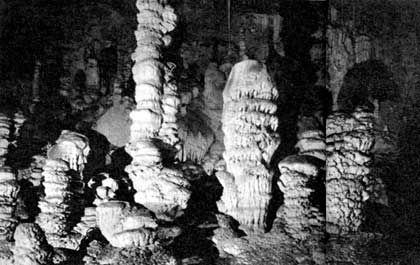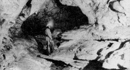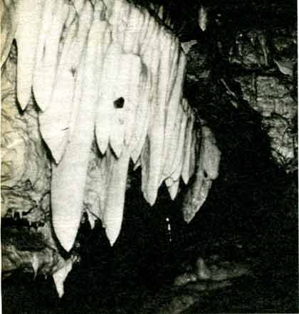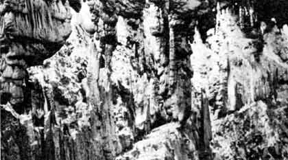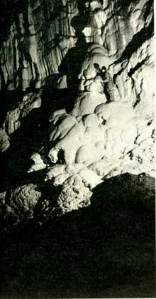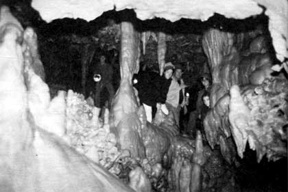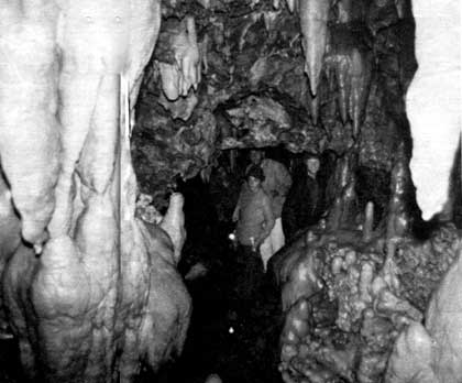 Calando, le acque scopersero dapprima la volta superiore di una nicchia che, prosciugato il laghetto, si rivelò l'imboccatura di una spelonca. «Andiamo a vedere dissero i giovani che controllavano il sifone e s'inoltrarono nella buia caverna, rischiarata appena dalla fiammella tremolante di un lume, dove mai prima di allora era stata impressa l'orma di un piede. Eppure tra le ombre che s'allungavano a disegnare irregolari figure nella grotta si cominciò a notare qualcosa di strano, di inimmaginabile: sottili aghi diafani pendevano dal soffitto qua e là; ceree, fragili candeline s'alternavano ogni qual tratto; sullo stesso pavimento scabroso dell'antro spuntavano, in corrispondenza di quei penduli e lattescenti ornamenti, altre levigate protuberanze. Quegli ardimentosi penetrarono nella caverna per alcune centinaia di metri: ecco, più avanti un laghetto, costeggiato strisciando lungo le pareti gocciolanti; sulla destra un anfratto, anzi no, è un cunicolo del quale non si vede la fine; un altro s'apre sulla sinistra… La marcia procede con prudenza, perché i piedi poggiano su pietre scivolose e coperte di fango, ma l'immaginazione sopravanza la sempre più incerta fiammella.