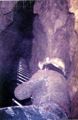 Qui a fianco, stalattiti tubolari (filiformi) nel “Ramo del Cigno” (Grotta della Bionda); qui sotto; risalita con scala a corda.