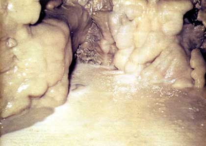 La grotta è abbastanza ampia, comunque occorre fare attenzione per non battere il capo contro qualche spuntone di roccia. Ora, dove la volta s'inclina con creste dentate, lo spettacolo assume contorni magia. Bianche e traslucide colonne uniscono il fondo al soffitto, dal quale scendono merlettate concrezioni striate d'arancione, frange gialline, candidi pizzi.