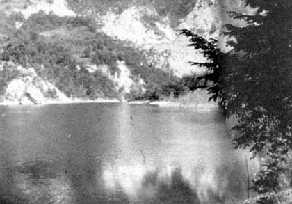 Qui sopra. II limpidissimo lago di Redona; in alto, a sinistra, la vorticosa cascata sul fondo dalla grotta; accanto, uno scorcio della trattoria meta abituale di fine viaggio per speleologi e turisti; a destra, alcune vedute dell’orrido di don Bianchini (Foto Glauco Bidoli)