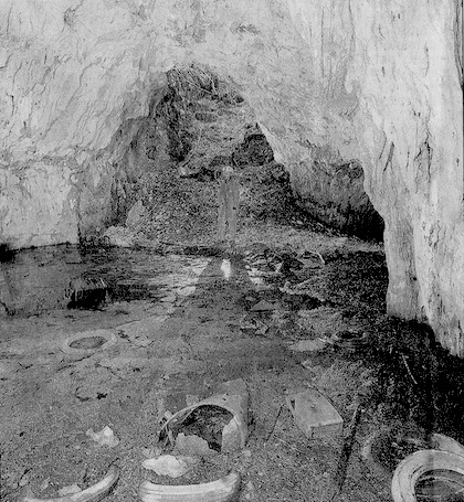 Un lago di idrocarburi pieno di pneumatici all’interno di una grotta vicino a Trebiciano; nel Pozzo Mattioli c’è chi ha addirittura gettato una Vespa (Foto Fabio Liverani)