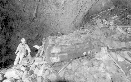 Uno speleologo osserva un’automobile Zastava scaricata nella parte superiore di una grotta