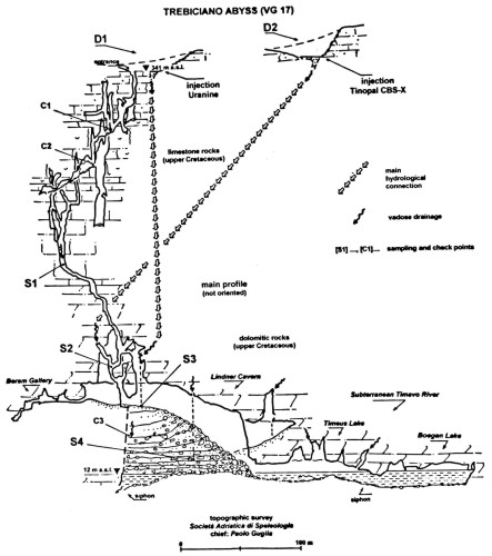 Il presente studio riguarda i risultati ottenuti mediante un test di tracciamento delle acque vadose presenti nell’Abisso di Trebiciano sul Carso Triestino. Sono stati immessi, separatamente, Uranina e Tinopal CBS-X in due doline soprastanti l’abisso, mediante immissione artificiale d’acqua, simulando un forte evento piovoso. I punti attrezzati per il controllo e la cattura delle acque, all’interno dell’abisso, sono stati 4: due lungo il sistema di pozzi principale ed altri due nella “Caverna Lindner”. In tutti questi punti, normalmente di forte infiltrazione, sono stati eseguiti campionamenti giornalieri di vario tipo, mentre per il solo punto a –250 m ha funzionato pure una sonda fluorimetrica per la misura in continuo dei due traccianti. Il test ha fornito interessanti dati sulle modalità di trasferimento delle acque superficiali in profondità, lungo l’abisso. © 2002 GSSG/IPOGEA. All rights reserved.