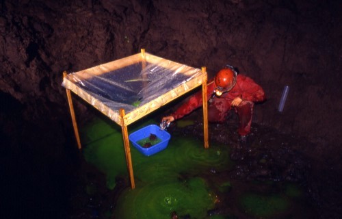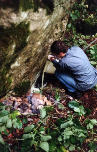 Foto 2. Arrivo del tracciante e prelievo dei fluocaptori  posti al punto S3 (Caverna Lindner), dopo poche ore dall’immissione.