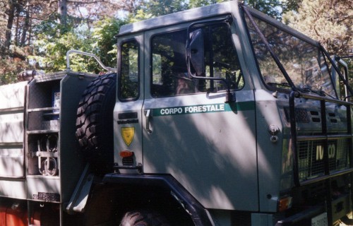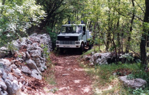 Foto 4-5. Autobotte del Corpo Forestale dello Stato; grazie all’aiuto dei forestali si sono potuti immettere 3,5 m3 d’acqua nelle doline scelte per il tracciamento, in modo da facilitare la diffusione dei traccianti nel sottosuolo.