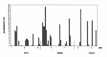 Fig. 3. Precipitazioni (mm) dei mesi aprile, maggio, giugno 2004 alla stazione meteorologica di AREA Science Park, loc. Padriciano. Precipitation (mm) April-June 2004 in weather station of AREA Science Park near Padriciano.