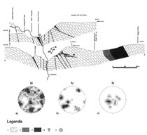 Prima di drenare verso la Sorgente Clinciza, si può ipotizzare che il “Rio del lago azzurro” penetri ancora verso N all’interno del Monte Stena, fino a trovare le condizioni per una sua retroversione. Ciò probabilmente (considerando il desunto, più probabile, vettore idraulico) lungo le grandi fratture dei sistemi di taglio NNE-SSW ed ENE-WSW genericamente in posizione “hk0” (referenziazione di B. Sander, su asse B1=_1 SE-NW dai dati di CUCCHI et al. 1987 e BALLARIN et al. 1994) (Fig. 6, a) che, già, hanno impostato parte del “Ramo centrale” e l’intero “Ramo Nord” del “Rio del lago azzurro” della Fessura del Vento, mentre il “Ramo terminale” che chiude la cavità è prevalentemente impostato su piani di stratificazione (SEMERARO, 1967). Detta retroversione può avvenire anche prima che il corso d’acqua raggiunga la piezometrica del livello sorgivo, semplicemente ostacolato dallo sbarramento profondo posto circa 5-600 m a N costituito dalle marne e dal Flysch della “sinclinale di Beca-Occisla”. Un’ipotesi alternativa è, che il “Rio del lago azzurro” si porti verso SE/SSE lungo interstrati e fratture, così da aggirare la cascata del Torrente Rosandra, poi volgere a NW verso la Clinciza: ipotesi però meno probabile giacché la massa carsificabile retrostante la cascata ha poco volume poiché subito a monte della sua soglia c’è il contatto con la “Marna a Cancer”.