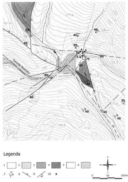 Fig. 7. Mappa idrogeologica dell’area della Sorgente Clinciza. 1: Calcare ad Alveoline e Nummuliti; 2: calcari marnosi; 3: marne; 4: Flysch marnoso-arenaceo; 5; depositi eluvio-colluviali, placche di detrito e brecce calcaree; 6: alluvioni; 7: strati; 8: faglie inverse principali; 9: faglie; 10: sorgenti e cavità (1 Buco del gamberi VG 4301, 2 Grotta presso la Fonte Oppia VG 4331, 3 Sorgente Clinciza, 4 condotta impenetrabile, 5 Cunicolo presso la Fonte Oppia VG 5228, 6 Sorgente sotto l’antica rocca di Moccò). Hydrogeological map of Clinciza Spring area. 1: Alveolinid-nummulitid limestone; 2: marly limestones; 3: marls; 4: marly-arenaceous flysch; 5: eluvio-colluvial deposits, talus, calcareous breccias; 6: alluvium; 7: layers; 8: main reverse faults; 9: faults; 10: springs and cavities (1 “Buco dei gamberi” VG 4301 (“Crayfish cave”), 2 “Cave near Fonte Oppia” VG 4331, 3 Clinciza Spring, 4 impassable conduit, 5 “Conduit near Fonte Oppia” VG 5228, 6 Spring under the ruins of Moccò castle).