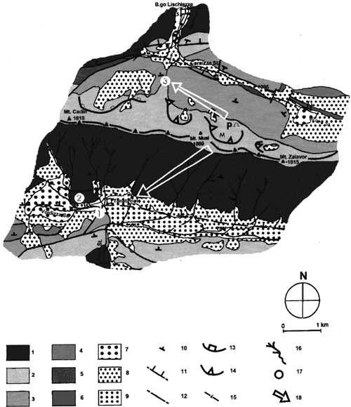 Fig. 2. Schema geologico, geomorfologico e idrogeologico della zona delle Cime del Monte Musi [tratto da Anselmi & Semeraro (1997), Ceretti (1965), Iacuzzi & Vaia (1977, 1981)]. Legenda: 1 = dolomie prevalenti (Triassico) (UL A); 2 = calcari e calcari dolomitici (Triassico) (UL B-C); 3 = calcari, calcari selciferi, calcari oolitici, calcari dolomitici (Giurassico) (UL D-E); 4 = calcari marnosi (Giurassico); 5 = calcari, calcari selciferi, calcari marnosi (Cretacico); 6 = Flysch marnoso-arenaceo (Cretacico) (UL F); 7 = morene (Quaternario); 8 = depositi di frana, depositi di falda e di cono (Quaternario); 9 = alluvioni (Quaternario); 10 = giacitura degli strati; 11 = faglia inversa; 12 = faglia; 13 = plateau strutturale inclinato; 14 = circo glaciale [M: acrocoro del Musi; P: Abisso “R. Pahor”]; 15 = dorsali spartiacque; 16 = idrografia; 17 = sorgente carsica, grotta sorgente [1: Sorgenti del Torre; 2: Sorgenti in sinistra del Torrente Voidizza; 3: Grotta dell’Uragano e Fontanon di Barman]; 18 = principali drenaggi carsici ipogei accertati mediante tracciamento. Scheme of geology, geomorphology and hydrogeology of the zone of the Peaks of Musi Mountains [taken from Anselmi & Semeraro (1997), Ceretti (1965), Iacuzzi & Vaia (1977, 1981)]. Legend: 1 = dolomites (prevailing) (Triassic) (LU-1); 2 = limestones and dolomitic limestones (Triassic) (LU-B-C); 3 = limestones, cherty limestones, oolitic limestones, dolomitic limestones (Jurassic) (LU-D-E); 4 = marly limestones (Jurassic); 5 = limestones, cherty limestones, marly limestones (Cretaceous); 6 = marly-arenaceous Flysch (Cretaceous) (LU-F); 7 = moraines (Quaternary); 8 = landslide deposits, talus, eluvio-colluvial (Quaternary); 9 = alluvial deposits (Quaternary); 10 = attitude of strata; 11 = reverse fault; 12 = fault; 13 = inclinated structural plateau; 14 = glacial cirque [M: plateau of Musi; P: “R. Pahor” Abyss]; 15 = watershed ridges; 16 = hydrography; 17= karstic spring, spring-cave [1: Springs of Torre Stream; 2: Springs left of Voidizza Stream; 3: “Grotta dell’Uragano” and “Fontanon di Barman” (springs)]; 18 = main karstic drainages proved with tracing test.