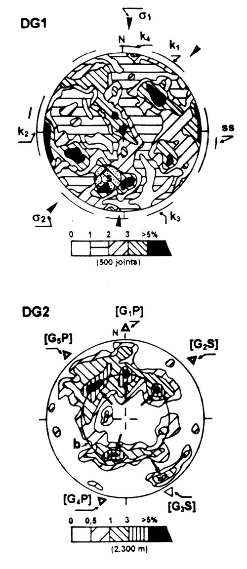 Sull’acrocoro, e zone limitrofe interessate dal carsismo in grande, il rilevamento statistico-strutturale (in funzione delle correlazioni col carsismo) ha mostrato la presenza di 4 sistemi prevalenti di fatturazione legati agli sforzi σ1a e σ1b, rispettivamente N-S e NE-SW, delle fasi Mesoalpina (Paleogene) e Neoalpina (Neogene) (Fig. 3, DG1). Detti sistemi si trovano, quasi sempre, contemporaneamente in posizione di taglio e di tensione. Essi sono: [k1] secondo NNE/NE-SSW/SW, [k2] secondo E/ESE-W/WNW, [k3] secondo SE/SSE-NW/NNW, [k4] secondo N-S. Le faglie e gran parte dei master joints appartengono al sistema [k3], corrispondente al sistema maggiormente incarsito; detto sistema [k3] risulta dominante come sistema di taglio rispetto σ1a tenuto conto di un B=β mesoalpino principale. I piani di stratificazione [ss] sono quasi costantemente attorno E/ESE-W/WNW, con locali oscillazioni di ±10-15° generalmente in prossimità di faglie, ed immersi attorno 50° nel quadrante N.