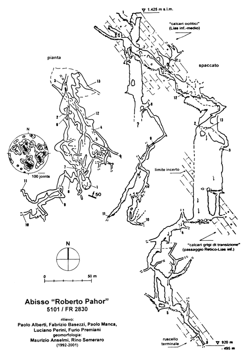 Fig. 4. Abisso “Roberto Pahor” 5101 / FR 2830, spaccato e pianta con elementi geomorfologici; rilievo GSSG: P. Alberti, L. Perini, F. Basezzi, P. Manca, F. Premiani (1992-2001). “Roberto Pahor” Abyss 5101 / FR 2830, section, map, geomorphology; survey GSSG.