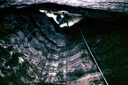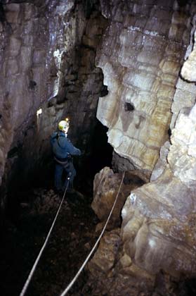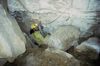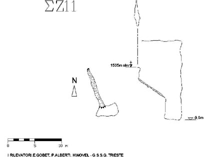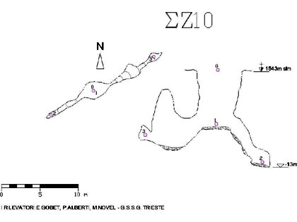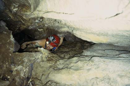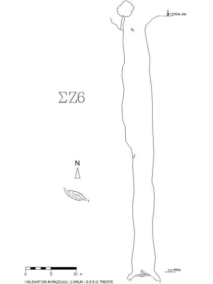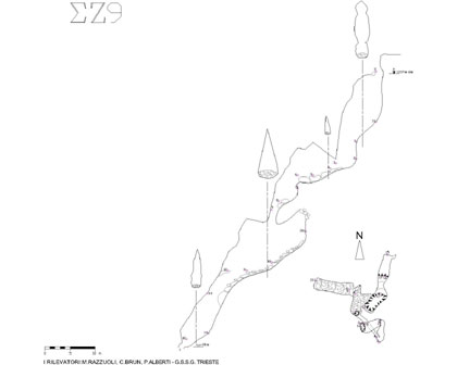 una bella grotta articolata, con concrezioni, due salette e qualche resto di animale caduto, ahimè, nell’intento di brucare la tenera erbetta dell’ingresso. Naturalmente oggi non abbiamo il materiale sufficiente per scendere, decidiamo di fare il rilievo fin dove eravamo arrivati e prendere qualche fotografie, così l’indomani dobbiamo “solo” esplorare. Si ritorna con i rinforzi e con Papo provetto cameraman, che al grido di “ara che figo” documenta perfettamente l’esplorazione della grotta SZ9. Ancora altri due bellissimi pozzi larghi, levigati con intrusioni di selce, veramente interessanti….e poi …una saletta discendente….e una strettoia in basso…minuscola…nooo, resto solo in tuta e provo ad infilarmi, effettivamente ci passo, non vedo niente però c’è un’aria, ma un’aria da ENE Bora!