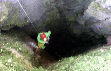 per fortuna ho sondato con il bastoncino prima di mettere i piedi sopra al vegetale…vuoto! Comincio a togliere il povero caprifoglio e fare un po’ di luce…effettivamente un bel pozzo diviso da un masso all’entrata! Evviva….però sarà il solito 50m e fine. Abbiamo giusto giusto una 50 e qualche attacco, dai andiamo…promette bene però, c’è anche aria…scendiamo, scendiamo..ma, continua..un meandro, un altro saltino…un altro meandro…un altro pozzo! Finalmente