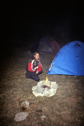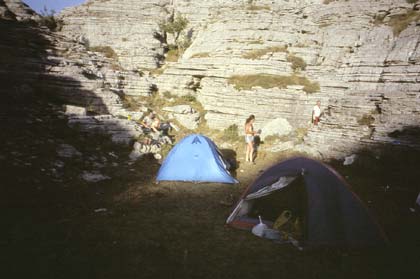Il campo avanzato era in un posto idilliaco, in una valletta verde con le mucche attorno, tranquillo, asciutto, silenzio. Il tramonto su Astraka infonde calma, riflessione. Intanto che Papo vantava la sua abbronzatura a strisce, Max cercava di far funzionare il fornelletto a gas, mentre Marina e Edo avevano scoperto che lo sterco di mucca bruciava alla grande, così in poco tempo vicino alle tende si poteva ammirare un magnifico cumulo di m….pronta all’uso! In effetti alla sera non faceva poi tanto caldo.