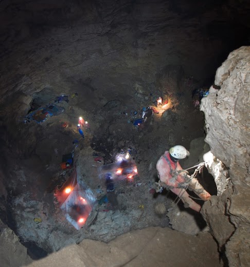 Al lato della caverna iniziale, proprio sotto la corda che porta alla parete, un meandro intasato per metà dalla neve, lascia fuoriuscire un alito caldo (certo, rispetto alla temperatura esterna!!!). Un paio di scomodi passaggi portano al primo salto della cavità, altro meandro fastidioso, alleggerito di alcune curve per permettere il passaggio, e parte un secondo pozzo di una quarantina di metri. Da qui un ulteriore meandro con uscita alquanto aerea e disagevole porta alla cima del pozzo da 180. Meandro e pozzo da 50 e si arriva in gallerie che a breve portano al campo italiano. Da qui si prende la corda in risalita, dall’altra parte del pozzo che porta al fondo. Qui si erano fermate le esplorazioni ungheresi nel 2005. Saliamo 10 metri, alcune condotte semi-intasate da ghiaie obbligano a strisciare per diverse decine di metri. L’ambiente si allarga e diventa pozzo. Sappiamo, dalle informazioni di Zsolt, uscito domenica, che qui sotto c’è un lago in cui è stata allestita una tirolese, che però obbliga ad una fatica mostruosa e a un rischio di bagno. Per questo motivo abbiamo portato con noi attacchi e trapano, la corda l’abbiamo presa dal campo italiano, Giusto arma il traverso e comincia a scendere dall’altra parte, arriva su un terrazzo ma la corda non basta. Torno nuovamente a strisciare nelle condotte verso il campo alla ricerca di uno spezzone da poter utilizzare, ne trovo uno con due lesioni che prontamente isolo. Alcuni problemi con l’impianto luce mi obbligano ad una sosta forzata, dopo svariate bestemmie e imprecazioni, apprendo la tecnica segreta per farlo funzionare correttamente, che mi servirà fino all’uscita di qui a due giorni: sberloni al porta batterie. Torno verso Giusto corda alla mano. Dopo avergliela consegnata, di modo che possa riprendere l’armo, raccolgo i sacchi e lo seguo. Una condotta completamente scavata tra ghiaie e fango conduce ad alcuni saltini, dopo un P17 arriviamo in corrispondenza di una corda parecchio tirata, praticamente un traverso verticale su una china piena di pietre instabili. Non scaricare e quasi impossibile, dopo averne urtato e fatta rotolare qualcuna, notiamo all’improvviso accendersi una ad una alcune luci sotto di noi: è il campo. Con passi felpati e sacco in spalla scendiamo delicatamente (certo che se uno decide di fare un campo sotto una corda di discesa, almeno dovrebbe scaricare quello che sta in bilico sopra di lui, mah!). Arriviamo al campo e salutiamo, sono in sette a riposare qui, gli altri sono in punta. Questi che sono rimasti si stanno preparando per uscire, perché altre squadre dovrebbero entrare tra domani e dopodomani. Ci posizioniamo in uno spiazzo, fortunatamente lontano dalla verticale di discesa, cuciniamo la solita minestra liofilizzata, qualche nocciola e un pezzo di cioccolata e poi via nei sacchi a pelo.