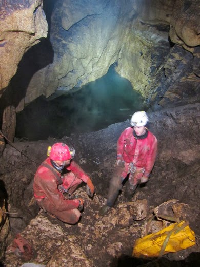 La notte passa veloce, e quando mi sveglio sono già passate 12 ore (sono sempre più convinto che in grotta si riesca a riposare meglio, ma sembra un discorso che vale solo per me). Belli freschi facciamo colazione, e quando si sveglia anche Leo, tornato dalla punta mentre noi dormivamo, discutiamo sul procedere della giornata. Alcune interessanti risalite attendono, poco sopra il sifone terminale, e, sebbene Leo abbia riposato solo 4-5 ore, si offre di venire con noi. Dal campo, allestito nella sala denominata Humbolt, si prendono alcune condotte basse, che portano a una successione di gallerie sfondate da crolli, in cui ci sono diversi passaggi in frana e ambienti ristretti. Ad un bivio tra due gallerie ci teniamo a sinistra, sebbene dopo qualche centinaio di metri si ricongiungano, dalla parte opposta alla direzione da noi presa si trova una fessura di oltre 40 metri, definita parecchio ostica. Un ulteriore bivio divide la via tra il pozzo da 140, e la galleria da 500 metri che porta al campo di x-point. Procediamo per basse gallerie fino al pozzone. Cominciamo la discesa in questo fantastico baratro di dimensioni spropositate, atterriamo sul fondo, dal quale, parte un meandro di 300 metri che si connette direttamente al “Grande Meandro”, il famoso meandro da 1 km che porta al fondo dell’abisso Gortani. Procediamo spediti in questo fantastico intrico di curve, camminando per quasi tutto il tempo alla sua base, fuorché alcuni passaggi aerei, all’esclusivo scopo di evitare le zone con acqua profonda, e quindi il bagno! Giusto se la passa peggio, non essendo fornito di stivali ma pedule, è obbligato ad arrampicare a mezzo metro d’altezza anche dove noi sguazziamo comodamente sul fondo. Verso la fine il soffitto si abbassa progressivamente, portando alla vista la galleria che ha originato il meandro, un tutto tondo con diametro superiore ai 5 metri. Facciamo una deviazione in una galleria laterale, dove ci dedichiamo ad una piccola pausa per rifocillarci. Tornati al meandro, lasciamo tutto l’occorrente per la risalita sul posto dove la effettueremo, e scendiamo gli ultimi salti all’esclusivo scopo di visitare il sifone terminale. Faccio finta di non vedere gli armi che sono stati usati per la discesa, probabilmente già vecchi quando messi dai primi esploratori sul finire degli anni ’60, e mi chiedo visto, che attacchi e trapano non mancano, perché sia così diffusa l’usanza, e cito testuali parole: “Se ga tegnu fin deso….”. Per strada troviamo la scritta a vernice dei primi a giungere quasi fin sul fondo, 27 dicembre 1968, e il pensiero non può che non andare ad immaginare come poteva essere arrivare ad una tale profondità, con le scale, attraverso meandri e passaggi malagevoli, vestiti con maglioni di lana e tute di cotone, con attese stratosferiche sui pozzi, ad aspettare il ritorno della squadra di punta, brr, vien freddo solo a pensarci, questi si che erano pazzi! Foto di rito, una chitarra mignon firmata “Icaro 1981” lasciata su di un ripiano attira la nostra curiosità. Torniamo verso la risalita, sui pozzi incontriamo i segni della piena, bombole dei sub che tentarono il sifone, incastrate a 30 metri di altezza, non deve essere bello trovarsi in questi luoghi d’estate. Arrivati sul posto cominciamo a prepararci, chi di noi andrà su? Quando scopriamo che bisogna arrampicare con il Ryobi (trapano a motore dal notevole peso ed ingombro), ci tiriamo subito indietro. Combattiamo una battaglia persa in partenza con Leo, informandolo scherzosamente che esistono ormai batterie ultraleggere e trapani di dimensioni accettabili, ma si sa che agli ungheresi piace il gioco duro, ed è già partito. Lo convinciamo dopo 5 metri a piantare un fix di sicura, pianta di suo un altro subito dopo per alzarsi e prende una cengia, da li traversa 20 metri e sparisce dalla nostra vista, sentiamo in lontananza il trapano lavorare e la corda sparire verso il buio. Dopo un’ora di questo gioco “senti trapano-dai corda”, arriva in cima, prepara un armo e torna sui suoi passi. Purtroppo non c’è proprio niente di interessante, è arrivato ad un soffitto dove una finestra ricadeva subito sopra al sifone, nulla di fatto. Sistemiamo il materiale, che lasceremo qua per la prossima squadra (ci sono ancora altre interessanti risalite in zona), e ci incamminiamo verso il campo. Una pausa per bere qualcosa di caldo sotto al 140, e poi spediti fino ad Humbolt.