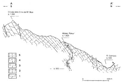 Il  versante Nord del Monte Musi è costituito da una monoclinale a franapoggio ove gli strati delle varie unità litologiche affioranti sono orientati attorno E-W  ed immersi verso N con inclinazioni mediamente di 45° .