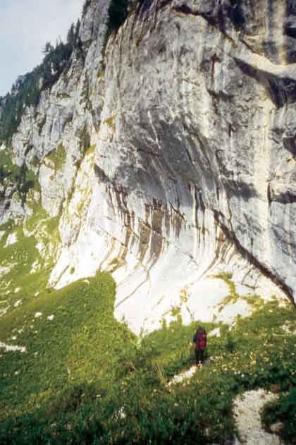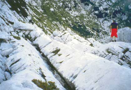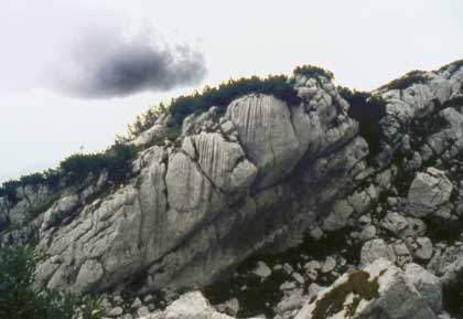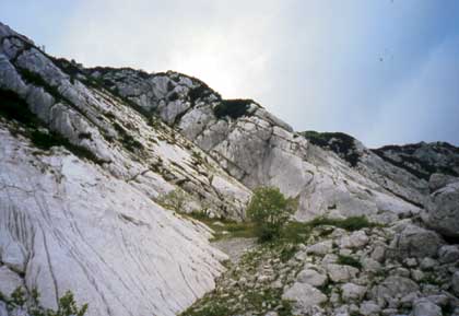 Sulle pareti calcaree si riconoscono ancora i segni  dell'escavazione glaciale.