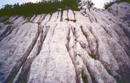 All'esterno, i piani di strato inclinati sono incisi dalle lunghe e profonde docce detti Rinnenkarren che solcano a volte interamente vaste superfici.